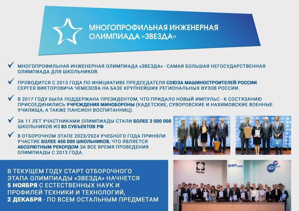 Многопрофильная инженерная олимпиада «Звезда» проводится Союзом машиностроителей России с 2013 года с целью развития и стимулирования интереса школьников к научно-исследовательской деятельности и будущей профессии. Олимпиада является самой масштабной негосударственной олимпиадой для школьников.